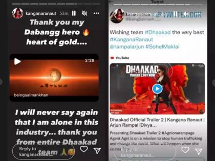 सलमान खाननं धाकडचा ट्रेलर शेअर केल्यानंतर कंगना राणौतनं त्याचे आभार मानले. थँक यू माझ्या दबंग हिरो, असं म्हणत कंगनानं इन्स्टा स्टोरीतून सलमानला धन्यवाद दिले. 'सलमानचं मन सोन्यासारखं आहे. इंडस्ट्रीमध्ये मी एकटी आहे असं मी आता कधीच म्हणणार नाही. धाकडच्या पूर्ण टीमकडून तुझे आभार,' असं कंगनानं पोस्टमध्ये म्हटलं आहे. यासोबत कंगनानं सलमानच्या पोस्टचा स्क्रीनशॉट शेअर केला आहे.