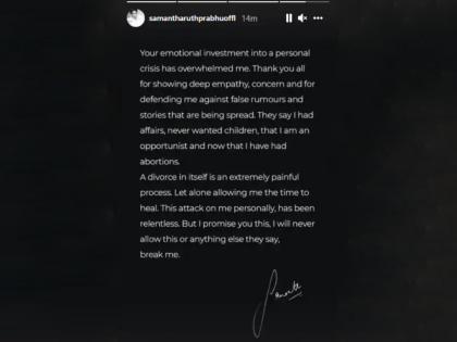 समांथाने काही दिवसांपूर्वीच इन्स्टाग्रामवर पोस्ट शेअर करून पतीसोबत घटस्फोटाची घोषणा केली होती. तिने लिहिले होते की, माझ्या शुभचिंतकांना मला हे सांगायचं आहे की, बराच विचार केल्यावर आम्ही दोघांनी वेगळे होण्याचा निर्णय घेतला. आमचे मार्ग आता वेगळे आहेत. आम्ही नशीबवान आहोत की, आमच्या मैत्रीला एक दशकापेक्षाही जास्त काळ झाला आहे. मला विश्वास आहे की, आमचा मैत्रीचा स्पेशल बॉन्ड नेहमी असाच राहील. तुमच्या सर्वांच्या सपोर्टसाठी धन्यवाद.