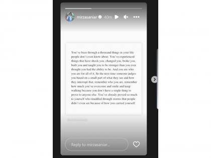 सानियाने तिच्या इन्स्टाग्राम स्टोरीमध्ये एक पोस्ट शेअर केली आहे. या पोस्टमध्ये ती म्हणते, "आयुष्यात तुम्ही हजारो गोष्टींचा सामना करत असता, ज्याबद्दल लोकांना काहीच माहीत नसतं. असे प्रसंगही येतात ज्यामुळे तुम्हाला धक्का बसतो, तुमच्यात बदल होतो, तुम्ही कोलमडून पडता. पण, या गोष्टी तुम्हाला जास्त ताकदवान बनवतात ज्याचा तुम्ही कधी विचारही केलेला नसतो. त्यामुळे पुढच्या वेळेस जर कोणी त्यांना दिसतंय त्यावरुन तुमच्याबद्दल मत बनवत असेल, तर लक्षात ठेवा तुम्ही कोण आहात. तुम्ही कोणत्या गोष्टींवर मात केलेली आहे ते आठवा. स्माइल करा आणि पुढे जात राहा. कारण, तुम्हाला कोणालाही सिद्ध करण्याची गरज नाही. तुम्ही आधीच तुम्हाला सिद्ध केलेलं आहे. तुम्ही त्या वादळांचा सामना केलेला आहे, जे लोकांनी पाहिलेलं नाही. कारण, तुम्ही ते कधीच कोणाला दाखवलेलं नाही."