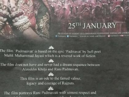 आ पर्यंतच्या सिने इतिहासात सर्वाधिक वादग्रस्त ठरलेला संजय लीला भन्साळी दिग्दर्शित ‘पद्मावत’ हा चित्रपट येत्या २५ जानेवारीला रिलीज होणार आहे. काल या चित्रपटाची रिलीज डेट अधिकृतरित्या जारी करण्यात आली. तामिळ, तेलगू आणि हिंदी अशा तीन भाषांमध्ये रिलीज होणा-या या चित्रपटाचे नव्या टाईटलसह नवे पोस्टरही मेकर्सनी जारी केले. या पोस्टरद्वारे ‘पद्मावत’चे दिग्दर्शक संजय लीला भन्साळी यांनी पुन्हा एका स्पष्टीकरण दिले आहे. होय, एक जाहिरात प्रसिद्ध करत, भन्साळींनी या चित्रपटावरून सुरु असलेल्या वादाच्या पार्श्वभूमीवर आपली बाजू नव्याने स्पष्ट केली आहे.
