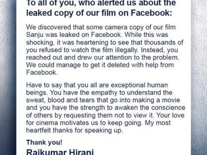 चित्रपट लीक होणे, हे आता नवे राहिलेले नाही. गेल्या काही वर्षांत अनेक मोठे चित्रपट आॅनलाईन लीक झाले आहेत. एखादा बिग बॅनरला चित्रपट इकडे चित्रपटगृहांत प्रदर्शित होतो आणि तिकडे आॅनलाईन लीक होतो. संबंधित चित्रपटाच्या मेकर्ससाठी ही धक्कादायक बाब असते. कारण यामुळे चित्रपटाची कमाई प्रभावित होणार असते. अलीकडे दिग्दर्शक राजकुमार हिरानी यांच्यासंदर्भातही हेच झाले. त्यांचा ‘संजू’ ज्यादिवशी रिलीज झाला आणि अगदी त्याचदिवशी आॅनलाईन लीक झाला. गत शुक्रवारी चित्रपटगृहांत ‘संजू’चा फर्स्ट डे फस्ट शो सुरू असताना दुसरीकडे इंटरनेटवर ‘संजू लीक’चा हॅशटॅग ट्रेंड करू लागला होता. ‘संजू’च्या लिंक लोकांनी धडाधड शेअर केल्यात. ट्विटरवरून सुरु झालेला हा प्रकार काहीच क्षणात फेसबुकपर्यंत पोहोचला. अर्थात ‘संजू’च्या निर्मात्यांनी एका क्षणाचाही विलंब न करता, सोशल मीडियावरून ‘संजू’ डाऊनलोड करणाऱ्या सगळ्या लिंक डिलिट केल्या. पण तोपर्यंत बरेच नुकसान झाले होते. कुठल्याही निर्माता - दिग्दर्शकाला याचे दु:ख होणे साहजिक आहे. राजकुमार हिरानीही याला अपवाद नाहीत. काल त्यांनी याच संदर्भात एक भावूक पोस्ट शेअर केलीे.