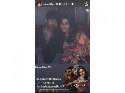 सारा अली खानने आपल्या सोशल मीडियावर अकाऊंटवर एक स्टोरी शेअर केली. यामध्ये तिने कार्तिकसोबतचा एक जुना फोटो पोस्ट केला आहे. यात दोघंही एकमेकांजवळ बसून हसत आहेत आणि खूप खूश दिसत आहेत. तसंच त्यांनी मोबाईल कव्हरमागील नोट दाखवतही एक फोटो शेअर केला आहे. तसंच हॅपी बर्थडे कार्तिक असं कॅप्शन दिलं आहे.