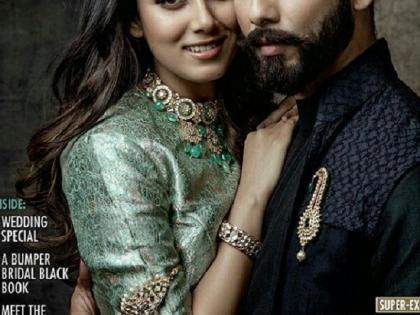 कव्हरपेजवरील फोटोत मीराने हिरव्या रंगाची सिल्क चोळी आणि पिंक लेहंगा परिधान केला आहे. मॅचिंग ज्वेलरी तिच्या सौंदर्यात भर घालतेयं. कुंदनचे बाजूबंद, हातातील कडे सगळेच मीरावर खुलून दिसतेय. शाहिदही रॉयल लूकमध्ये एकदम हटके दिसतोय.