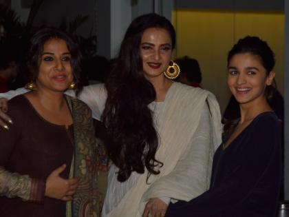 'उमराव जान' आणि 'बेगम जान' यांच्यासोबत या स्पेशल स्क्रीनिंगला हजेरी लावली ती अभिनेत्री आलिया भट हिनं. बॉलिवूडच्या दिग्गज अभिनेत्रींसोबत आलियानंही खूप धम्माल केल्याचं या फोटोत पाहायला मिळतंय.तिघी एकमेकींची कंपनी एन्जॉय करत असल्याचं पाहायला मिळालं. 'बेगम जान' या सिनेमाची कथा भारत-पाकिस्तान फाळणीनंतरच्या बंगालवर आधारित आहे.1947 साली फाळणीनंतर बेगम जानचं घर दोन भागात विभाजित झालं. घराचा काही हिस्सा भारतात तर काही पाकिस्तानात राहिला. सरकारी आदेशानंतरही बेगम जान आपलं घर सोडण्यास तयार होत नाही. त्यानंतर घर वाचवण्याचं आणि ते तोडण्याचा संघर्ष युद्धात बदलतो. या सिनेमात विद्याची भूमिका नीडर स्वरुपाची आहे. विद्यासोबत या सिनेमात नसिरुद्दीन शाह, आशीष विद्यार्थी, इला अरुण, रणजित कपूर, चंकी पांडे आणि गौहर खान पाहायला मिळणार आहेत.