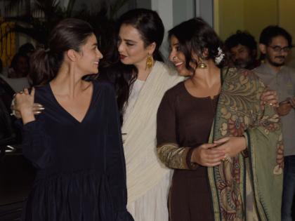 ब लिवूड अभिनेत्री विद्या बालन सध्या बेगम जान या आगामी सिनेमाबाबत बरीच उत्सुक आहे. रसिकांमध्येही विद्याच्या या भूमिकेविषयी उत्कंठा आहे. पुढच्या आठवड्यात हा सिनेमा रसिकांच्या भेटीला येणार आहे. मात्र हा सिनेमा रसिकांच्या भेटीला येण्याआधी रसिकांना अनोखं दृष्य पाहायला मिळालं.ते म्हणजे उमराव जान आणि बेगम जान एकत्र आल्याचं.हिंदी चित्रपटसृष्टीच्या उमराव जान अर्थात अभिनेत्री रेखा आणि बेगम जान म्हणजेच अभिनेत्री विद्या बालन यांची भेट घडून आली.