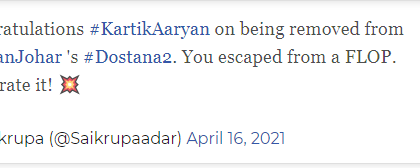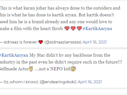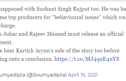 सुशांत सिंग राजपूतसारखे त्याच्या मागे पडू नका की तो फासावर लटकण्यासाठी लाचार होईल. गिधाड्यांनो त्याला एकट्याला सोडा.त्यानंतर कार्तिक आर्यनचे चाहते त्याच्या समर्थनात पुढे आले आहेत.सोशल मीडियावर पुन्हा एकदा करण जोहरवर नेटीझन्स संताप व्यक्त करत आहेत.