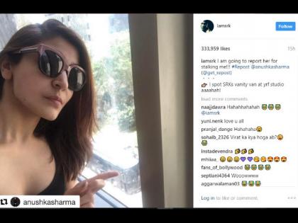 झाले असे की, अनुष्काने आपल्या सोशल अकाऊंटवर एक फोटो शेअर केला. मी वायआरएफ स्टुडिओत शाहरूखची व्हॅनिटी व्हॅन पाहिली, असे तिने याखाली लिहिले. मग काय, शाहरूखने अनुष्काने पोस्ट केलेला हा फोटो रिपोस्ट करत, मी याबद्दल अनुष्काची तक्रार करणार असे सांगून टाकले. माझा पिच्छा केल्याबद्दल मी तुझी तक्रार करणार आहे, असे शाहरुखने तिला उद्देशून लिहिले.