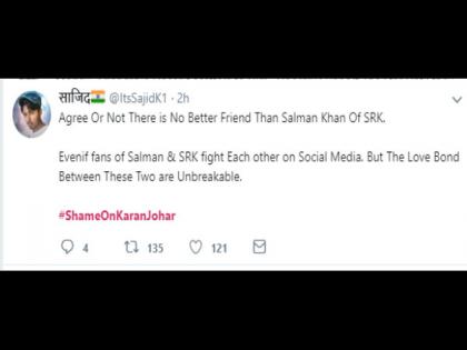 करणने शाहरुखला अक्षयपेक्षा कमी लेखणाऱ्या पोस्टला लाईक केले आणि शाहरुखचे चाहते भडकले. मग काय, या चाहत्यांनी करण जोहरचा चांगलाच क्लास घेतला. करणने शाहरुखला धोका दिला, मागून वार केला, असे काय काय शाहरुखच्या चाहत्यांनी लिहिले आणि ‘शेमआॅनकरणजोहर’ हा हॅशटॅग ट्रेंड करू लागला.