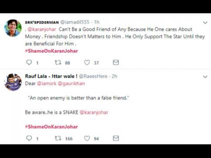 करण जोहर व शाहरुख खानची मैत्री बॉलिवूडची सर्वाधित जुनी व सच्ची मैत्री आहे. पण अलीकडे असे काही झाले की, चाहते या मैत्रीकडे संशयाच्या नजरेतून बघू लागले आणि बघता बघता सोशल मीडियावर ‘शेमआॅनकरणजोहर’ हा हॅशटॅग ट्रेंड झाला.