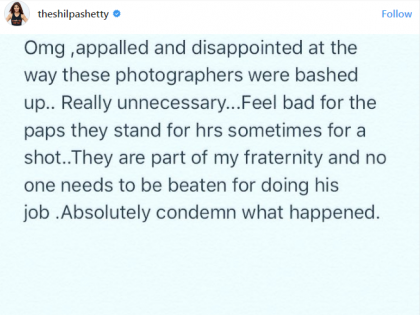 यावर संपूर्ण प्रकाराबाबत शिल्पाकडून सोशल मीडियावर स्टेटमेंट जारी करण्यात आले आहे. शिल्पाने आपल्या ट्विटर अकाऊंटवर लिहिले आहे, ''हे देवा ! ज्या प्रकार या फोटोग्राफरांना मारण्यात आले आहे ते अत्यंत वाईट आहे. हे सगळे कारण नसताना झाले आहे.'' पुढे ती म्हणाली आहे. ''जो काही प्रकार घडला त्याबाबत मला दु:ख झाले आहे. हे फोटोग्राफर्स एक फोटोसाठी तासनतास उभे असतात. कोणालाही आपल्या कामासाठी मारणं जाणे चुकिचे आहे. हे संपूर्ण प्रकरण निंदनीय आहे.'' शिल्पाने या संपूर्ण प्रकरणाचा उल्लेख पापीराज म्हणून केला आहे.ट्विटरवर संपूर्ण प्रकारची निंदा करण्यात येते आहे. पार्टी असो किंवा रेस्टॉरंट, बॉलिवूड स्टार जिथे जातात, तिथे कॅमेरा त्यांचा पाठलाग करत असतो. त्यामुळे अनेक वेळा अशा प्रकारचे हल्ले मीडियावर करण्यात आले आहेत.