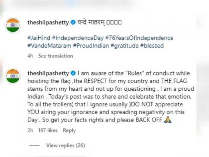 ट्रोलर्सकडे एरवी दुर्लक्ष करणाऱ्या शिल्पाने यावेळी मात्र त्यांना सडेतोड उत्तर दिले. ट्वीट करत तिने लिहिले, 'झेंडा फडकवतानाचे सर्व नियम मला माहित आहेत. देश आणि तिरंग्याचा मी मनापासून सम्मान करते प्रश्न विचारण्यासाठी नाही. मला भारतीय असल्याचा अभिमान वाटतो. आजची पोस्ट तीच भावना साजरा करण्यासाठी केली आहे. इतर दिवशी मी सहसा ट्रोलर्सला इग्नोर करते पण आज नाही. म्हणून तुम्हीच तुमचे तथ्य तपासा.'