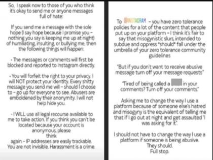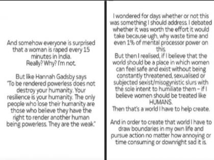 इंस्टाग्राम स्टोरीवर तिने बरेच पोस्ट केले आहेत. सुरूवात भारतातील महिलांविरोधात होणाऱ्या गुन्ह्यांपासून केली. लिहिले की, भारत महिलांविरोधात होणाऱ्या लैंगिक शोषणासाठी असुरक्षित देश मानला जातो. बलात्कार भारतात होणारा सर्वात कॉमन गुन्हा आहे. प्रत्येक 15 मिनिटाला एका महिलेवर बलात्का होतो. भारतात 70 टक्के महिला घरगुती हिंसेला बळी पडतात. प्रत्येक नवव्या मिनिटाला कोणाचा नवरा किंवा नवऱ्याच्या नातेवाईक वाईट व्यवहार केला जातो. प्रत्येक तिसरी महिला घरातील लैंगिक शोषण किंवा शारिरीक हिंसेचा सामना करते. सोबतच मायक्रोसॉफ्टने ग्लोबल यूथ ऑनलाइन बिहेवियरल सर्वे केले होते. त्यात 53 टक्के रेस्पोंडेंटसोबत भारत सायबर छळवणूक करण्यात तिसऱ्या क्रमांकावर होता. विशेष म्हणजे लहान मुलांनी ऑनलाइन छळवणूकचा अनुभव आल्याचे सांगितले. दरवर्षी जगभरात जवळपास आठ लाख लोकांनी आत्महत्या केली आहे. यात 15 टक्के म्हणजेच एक लाख पस्तीस हजार लोक भारतात राहणारे आहेत.