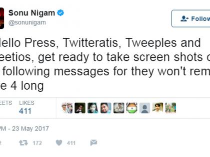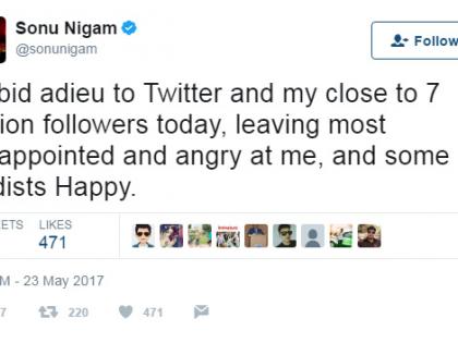 यानंतर सोनूने एकापाठोपाठ एक २४ ट्विट केलेत आणि आपण ट्विटर सोडत असल्याचे जाहिर केले. या ट्विटमध्ये सोनूने अभिजीत आणि परेश रावल यांचे नावही घेतले. अभिजीत दांच्या विचारांशी अनेकजण असहमत असू शकतील. पण शहलाने भाजपावर लावलेला सेक्स रॅकेट चालवण्याचा आरोप योग्य होता? त्यांचे अकाऊंट डिलीट व्हायला नको होते का? एक महिला गौतम गंभीरचा फोटो आर्मी जीपच्या समोर लावू शकते. पण परेश रावल यांच्यावर टीका होते. अरूंधती राय यांना काश्मीरवर आपले विचार मांडण्याचा अधिकार आहे. पण उर्वरित कोट्यवधी भारतीयांनाही त्यांच्यावर टीका करण्याचा अधिकार आहे, असे अनेक ट्विट सोनूने केले आहेत.Really? They suspended his account? Why? 90% of Twitter accounts then should be suspended too for worse fanaticism, Foul language & Threats! https://t.co/JwopfD44jl— Sonu Nigam (@sonunigam) 23 May 2017