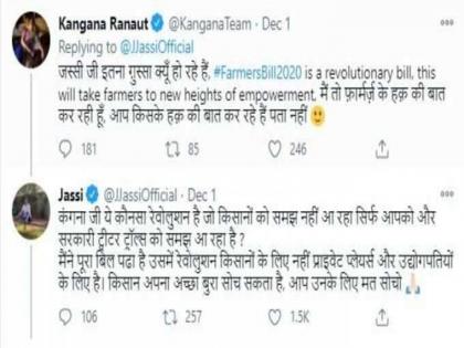 जस्सीच्या या ट्विटवर कंगनाने उत्तर दिलं की, जस्सीजी इतका राग का येतोय तुम्हाला. #FarmersBill2020 is a revolutionary bill, this will take farmers to new heights of empowerment, मी तर केवळ शेतकऱ्यांच्या हक्काबाबत बोलते आहे. तुम्ही कुणाच्या हक्काबाबत बोलत आहात माहीत नाही.