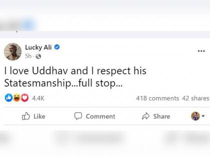 लकी अली यांनी फेसबुकवर एक पोस्ट शेअर केली आहे. यात मुख्यमंत्र्यांना पाठिंबा देत, 'आय लव्ह उद्धव, मी त्यांच्या राज्यकारभाराचा आदर करतो. विषय संपला,' असं त्यांनी त्यांच्या पोस्टमध्ये म्हटलं आहे. सध्या त्यांची ही पोस्ट व्हायरल होत असून अल्पावधीत तिला ३ हजारांपेक्षा जास्त लाइक्स आणि कमेंट्स आल्या आहेत.
