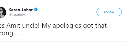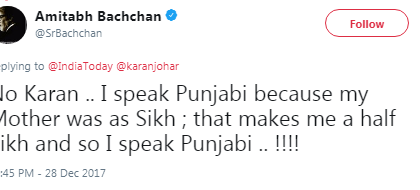 करणच्या या वक्तव्याचा बिग बींनी चांगलाचा समाचार घेतला. करणच्या या वक्तव्याला उत्तर देताना अमितजींने ट्वीट केले की. करण मी पंजाबी भाषा यामुळे बोलतो कारण माझी आई शीख होती. त्यामुळे मला पंजाबी भाषा ही बोलता येते. बिग बींचे हे ट्वीट बघून करण जोहने लगेच आपल्या वक्तव्याबाबत माफी मागितली आहे. होय, अमिक अंकल, मला माफ करा. असे ट्वीट करणने केले आहे.