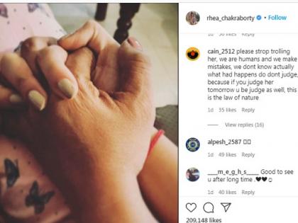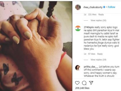 सुशांत सिंह राजपूतच्या आत्महत्येनंतर रिया चक्रवर्ती कधी नव्हे इतकी चर्चेत आली होती. त्याच्या मृत्यूशी संबंधित ड्रग्ज प्रकरणी तिला तुरूंगाची हवा खावी लागली होती. एक महिन्यानंतर रिया जामिनावर तुरुंगातून बाहेर आली आणि त्यानंतर आता तिचे आयुष्य पूर्ववत होताना दिसत आहे. सुशांत प्रकरणानंतर रिया चक्रवर्ती सोशल मीडियापासून दुरावली होती. मात्र परवा महिला दिनानिमित्ताने रियाने तिच्या इन्स्टाग्राम अकाऊंटवर एक फोटो शेअर केला होता. तब्बल सहा महिन्यानंतर रिया सोशल मीडियावर अॅक्टिव्ह झालेली पाहून प्रतिक्रिया उमटणे स्वाभाविक होते. त्यानुसार, त्या उमटल्या. रियाच्या पोस्टवर शेकडो लोकांनी कमेंट्स केल्या. काहींनी तिला ट्रोल केले. पण काही मात्र रियाची माफी मागताना दिसले.