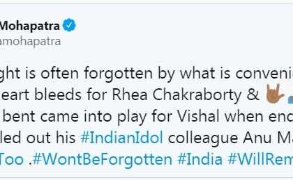 विशालचे हे ट्वीट पाहून सोना मोहपात्रा मात्र भडकली. ‘ददलानीला रिया चक्रवर्तीसाठी वाईट वाटतेय. विशाल ददलानीचा हा न्याय तेव्हा कुठे होतो जेव्हा अनेक महिला त्याचा इंडियन आयडलचा सहकारी अन्नू मलिकविरोधात बोलत होत्या,’अशा शब्दांत तिने विशालवर निशाणा साधला.