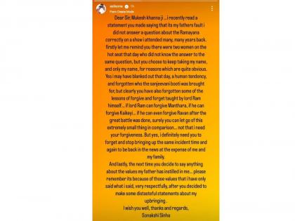 बॉलिवूड अभिनेत्री सोनाक्षी सिन्हाने अभिनेते मुकेश खन्ना यांना चोख उत्तर दिलं आहे. काही वर्षांपूर्वी सोनाक्षीला केबीसी या शोमध्ये विचारण्यात आलेल्या रामायण बाबतच्या प्रश्नाचं उत्तर देता न आल्यामुळे तिला ट्रोल केलं गेलं होतं. त्याबाबत इतक्या वर्षांनी आता मुकेश खन्ना यांनी एका मुलाखतीत भाष्य करत सोनाक्षीचे वडील आणि ज्येष्ठ अभिनेते शत्रुघ्न सिन्हा यांच्या संस्कारांवर प्रश्नचिन्ह उपस्थित केलं. त्यानंतर सोनाक्षीने पोस्ट शेअर करत मुकेश खन्ना याना उत्तर दिलं आहे.