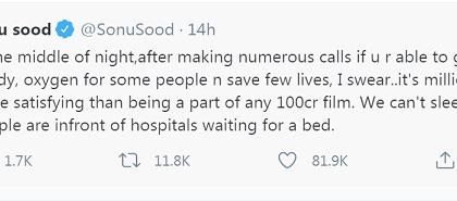 अर्ध्यारात्री मला लोकांचे मदतीसाठी फोन येत आहेत. काही गरजू रूग्णांना बेड मिळवून देऊन, काहींना ऑक्सिजनची मदत करून लोकांचे जीव वाचत असतील तर यापेक्षा मोठे समाधान नाही. शपथेवर सांगतो, 100 करोडी सिनेमाचा भाग बनण्यापेक्षा यातून मिळणारे समाधान लाखपटींनी मोठे आहे. लोक रूग्णालयाबाहेर बेडसाठी ताटकळत असताना आपण शांतपणे झोपू शकत नाही़..., असे त्याने ट्विटमध्ये लिहिले आहे.