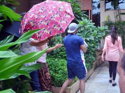 श क्रवारी रात्री शाहीद कपूरची पत्नी मीरा हिने एका गोंडस मुलीला जन्म दिला. आज रविवारी मीराला रूग्णालयातून सुटी झाली. शाहीद स्वत: आपल्या लहानशा परीला घरी घेऊन आला. ही नन्ही परी म्हणजे शाहीद व मीराच्या काळजाचा तुकडा. या काळजाच्या तुकड्याला छातीशी कवटाळून शाहीद रूग्णालयातून बाहेर पडला. मीरा समोर आणि शाहीद आपल्या बेटीला घेऊन मागे असे तिघेही घरी पोहोचले. याचदरम्यान पावसाचे थेंब लागले. लगेच कुणीतरी शाहीदच्या डोक्यावर छत्री धरली आणि शाहीदची चिमुकली पापासोबत घरी आली. याचे काही फोटो आम्ही तुमच्यासाठी घेऊन आलो आहोत. पर्यायाने शाहीद व मीराच्या बाळाचे हे पहिले फोटो आहेत. तेव्हा पाहा तर...!!