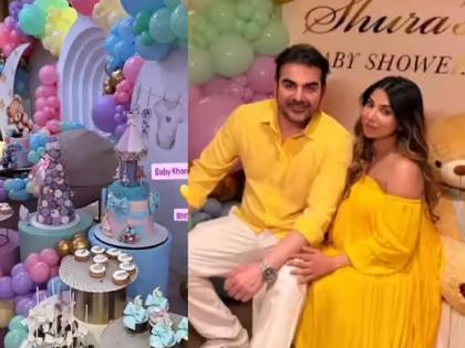 शूरा खानच्या बेबी शॉवरची झलक समोर आली आहे. रंगीबेरंगी फुगे, टेडी बिअर, 'बेबी खान' अशी नेमप्लेट असं सुंदर डेकोरेशन केलेलं दिसत आहे. मधोमध एक छान केक, त्यावरही आकर्षक सजावट, लाईट्स अशा वातावरणात शुराचं डोहाळजेवण साजरं झालं. पिवळ्या रंगाच्या स्टायलिश ड्रेसमध्ये शूरा कमालीची सुंदर दिसत आहे. तर अरबाज खाननेही पिवळ्या रंगाचा शर्ट परिधान करत ट्विनींग केलं आहे. दोघांची जोडी खूप गोड दिसत आहे. तसंच दोघंही येणाऱ्या चिमुकल्या पाहुण्याच्या स्वागतासाठी सज्ज आहेत.