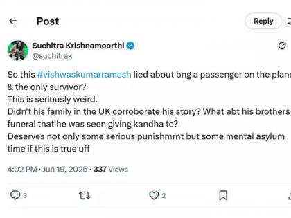 सुचित्रा कृष्णमूर्तीने एक्स अकाउंटवर लिहिले की, 'तर हे विश्वास कुमार रमेश विमानात प्रवासी असल्याचे आणि एकमेव वाचलेले असल्याचे खोटे बोललेत? हे खरोखरच विचित्र आहे. युकेमधील त्यांच्या कुटुंबाने त्यांच्या कथेची पुष्टी केली नाही का? त्याच्या भावाच्या अंत्यसंस्काराचे काय, ज्यामध्ये तो शवपेटी घेऊन जाताना दिसला होता?' सुचित्राने पुढे लिहिले की, जर हे खरे असेल तर विश्वास कुमार रमेश कठोर शिक्षेस पात्र आहेत. किंवा त्यांना मानसिक रुग्णालयात पाठवले पाहिजे.