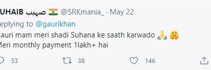 या सगळ्यांमध्ये मात्र एका चाहत्याने अशी काही कमेंट केली की सारेच थक्क झाले. युजरच्या एका कमेंटने सोशल मीडियावर सा-यांचेच लक्ष वेधून घेतले. चाहत्याने सुहानाशी लग्न करण्याची इच्छा व्यक्त केली. थेट गौरीला पोस्टवर कमेंट करत म्हटले की, ''गौरी मॅम माझे लग्न सुहानाशी लावून द्या. माझी सॅलरी 1 लाख+ आहे''.