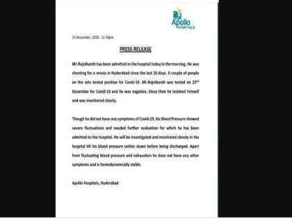 अपोलो रुग्णालयाने स्टेटमेंटमध्ये पुढे म्हटले आहे की, रजनीकांत यांच्यात कोरोनाची कोणतीही लक्षणं दिसून येत नाहीयेत. केवळ रक्तदाब वाढल्याने त्यांना रुग्णालयात दाखल करण्यात आले आहे. त्यांचा रक्तदाब नियंत्रणात आल्यावर त्यांना रुग्णालयातून सोडण्यात येईल.