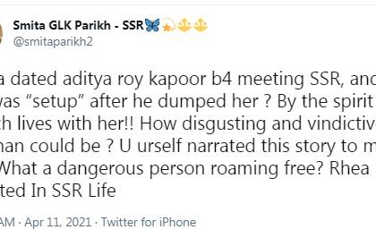 ‘रिया आदित्य रॉय कपूरला (Aditya Roy Kapoor) डेट करत होती, अर्थात सुशांतला डेट करण्यापूर्वी. आदित्यने सोडल्यानंतर ती कशी सावरली, तर त्या अतृप्त आत्म्याच्या मदतीऩे. एक अतृप्त आत्मा तिला मदत करतो. एक महिला किती खालची पातळी गाठू शकते? तू स्वत: ही कहाणी कितींना ऐकवली ताई? एक धोकादायक व्यक्ती बिनबोभाट फिरत नाहीये ना? रियाला सुशांतच्या आयुष्यात पाठवण्यात आले होते,’ असे ट्विट स्मिताने केले आहे.