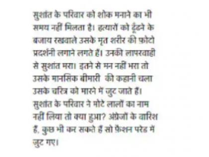 पुढे पत्रात लिहिलेय, ‘प्रसिद्धीसाठी अनेक बनावटी, ढोंगी मित्र, भाऊ, मामा मनात येईल ते बोलत आहेत. सुशांतचे कुटुंब असण्याचा काय अर्थ आहे, हे सांगणे त्यामुळेच गरजेचे झाले आहे.