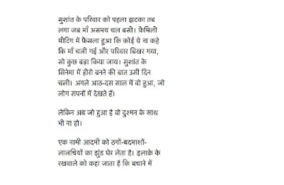 सुशांतचे आईवडिल कष्टाची भाकर कमावून खाणारे लोक होते. पाच आनंदी हसती-खेळती मुलं होती. त्यांना योग्य संस्कार, संधी मिळाव्यात म्हणून 90 च्या दशकात आईवडील गाव सोडून शहरात आले होते. घर आणि मुलांच्या शिक्षणासाठी त्यांनी स्वत:ला वाहून घेतले. पहिल्या मुलीत जादू होती. कोणी आले आणि हळूच तिला परिकल्पनेतील देशात घेऊन गेला. दुसरी राष्ट्रीय टीमसाठी क्रिकेट खेळली. तिसरीने कायद्याचे शिक्षण घेतले आणि चौथीने फॅशन डिझाईनमध्ये डिप्लोमा घेतला. पाचवा सुशांत होता. सुशांतच्या कुटुंबाने ना कुणाकडून काही घेतले, ना मदत मागितली... ’