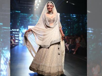 सुष्मिताने ग्लिटरी चोळीवर लहेंगा परिधान केला होता. या पोशाखावर तिने एक हेवी दुपट्टाही कॅरी केला होता. त्याचबरोबर हेवी ज्वेलरीमध्ये ती एखाद्या नववधूप्रमाणे दिसत होती. ड्रेसला मॅचिंग असा कपाळावर टीका लावल्याने तिच्या सौंदर्यात आणखीनच भर पडली होती. वयाच्या ४२व्या वर्षी सुष्मिताचा हा नववधू अंदाज अनेकांना भावला नसेल तरच नवल. कारण जेव्हा सुष्मिता रॅम्पवर उतरली तेव्हा अनेकांनी तिची छबी टिपण्याचा प्रयत्न केला.