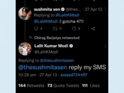 ललित मोदींच्या २०१३ सालच्या ट्विटचा स्क्रीनशॉट ट्विटरवर मोठ्या प्रमाणात व्हायरल होत आहे. या ट्विटमध्ये ललित सुष्मिताला टॅग करत माझ्या एसएमएसला उत्तर देण्यास सांगत आहे. या ट्विटनंतर यूजर्स त्यावर जोरदार कमेंट करत आहेत. इथूनच त्यांच्या नात्याची सुरुवात झाली असं कुणी म्हणतंय. तर कोणी ललित मोदींची स्तुती करत आहे. तथापि, हे ट्विट ९ वर्षे जुने आहे आणि ते आता सुष्मिता आणि ललितच्या नात्याला जोडून पाहिले जात आहे.