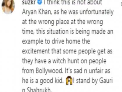 सुझानने इन्स्टाग्रामवर एक पोस्ट शेअर करत या प्रकरणी तिचं मत मांडलं आहे. "मला वाटतंय ही चर्चा फक्त आर्यन खानची नाही. दुर्दैवाने तो चुकीच्या वेळी चुकीच्या ठिकाणी सापडला. या प्रकरणाकडे एक उदाहरण म्हणून नक्कीच पाहता येईल. अनेक जण बॉलिवूडमधील लोकांना लगेचच विच हंट करायला सुरुवात करतात. ही खरंच फार चुकीची आणि त्रासदायक घटना आहे. कारण, तो खरंच फार गुणी मुलगा आहे. मी गौरी आणि शाहरुखसोबत आहे", अशी पोस्ट सुझानने केली आहे.