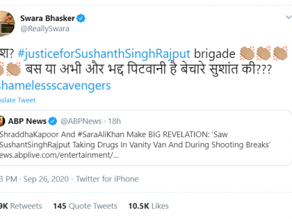 सुशांत सिंग राजपूतने गेल्या 14 जूनला जगाला अलविदा म्हटले. सुशांतच्या मृत्यूला 3 महिन्यांपेक्षा अधिक काळ लोटला पण अद्यापही त्याच्या मृत्यूचे गूढ कायम आहे. सुशांत प्रकरणाचा तपास करता करता एनसीबी बॉलिवूडच्या ड्रग्ज कनेक्शनपर्यंत पोहोचली आणि सुशांत प्रकरणावरून सगळा फोकस बॉलिवूडच्या या ड्रग्ज प्रकरणावर केंद्रीत झाला. ड्रग्ज प्रकरणी दीपिका पादुकोण, सारा अली खान, श्रद्धा कपूर, रकुल प्रीत सिंह या बड्या अभिनेत्रींची नावे समोर आल्यानंतर तर खळबळ माजली. या अभिनेत्रींच्या एनसीबी चौकशीत पुन्हा एकदा सुशांतचे नाव समोर आले. सुशांत व्हॅनिटी व्हॅनमध्ये ड्रग्ज घ्यायचा, असा खुलासा सारा व श्रद्धाने चौकशीत केला. या पार्श्वभूमीवर आता अभिनेत्री स्वरा भास्करने प्रतिक्रिया दिली आहे. स्वराने एक न्यूज आर्टिकल शेअर करत, काहीशा नाराजीच्या सूरात ट्विट केले.