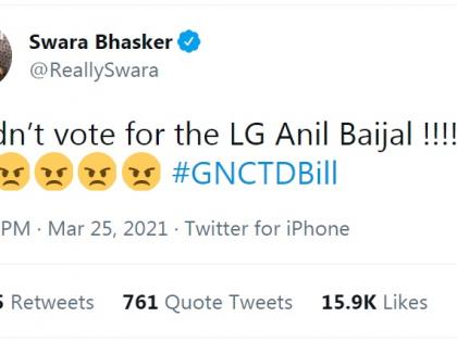 दिल्लीच्या नायब राज्यपालांचा अधिकार वाढवणारे विधेयक बुधवारी राज्यसभेतही मंजूर झाले. बॉलिवूड अभिनेत्री स्वरा भास्करने यावर उपरोधिक प्रतिक्रिया दिली आहे.