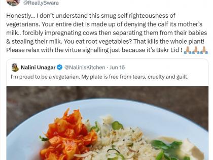 स्वराने लिहलं, 'खरं सांगायचे तर मला शाकाहारी लोकांबद्दल काही समजत नाही. तुमचा संपूर्ण आहार गायीच्या दुधावर अवलंबून असतो. एका बछड्याला आपल्या आईच्या दुधापासून दूर ठेवलं जातं. गायींना बळजबरीने गर्भधारणा करवली जाते, नंतर गायींना बाळांपासून वेगळं करुन त्यांचं दूध चोरलं जातं. याशिवाय तुम्ही ज्या मुळ भाज्या खाता, ज्यामुळे संपूर्ण वनस्पतीही नष्ट होते. पण, आज तुम्ही लोकांनी थोडा आराम केलं तर बरं होईल, कारण आज बकरी ईद आहे.