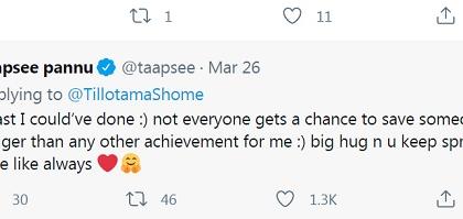 तापसीने तिलोत्तमाच्या या ट्विटला उत्तर देत लिहिले, ‘ मला एखाद्याचा जीव वाचवण्याची संधी मिळाली असताना मी तो जीव वाचवणार नाही, असे शक्य नाही. माझ्या स्वत:साठीही ही सर्वात मोठी उपलब्धी आहे आणि तुझे प्रेम मला असेच मिळत राहो.’