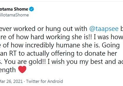 अभिनेत्री तिलोत्तमा हिने एक ट्विट केले आणि तापसीच्या या कौतुकास्पद कामाची चर्चा सुरू झाली. तिलोत्तमाने लिहिले, ‘मी कधी तापसीसोबत काम केलेले नाही. पण ती खूप मेहनती आहे, हे मला माहित आहे. मात्र ती इतकी महान आहे, हे मला माहित नव्हते. तापसीने तिच्या प्लेटलेट्स डोनेट करण्याचे महान काम केले. तापसी तुला खूप खूप शुभेच्छा आणि अभिनंदन.’