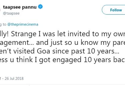 ‘खरचं? आश्चर्यचं आहे; माझा साखरपुडा अन् मलाचं बोलवलं नाही. तुमच्या माहितीसाठी सांगते माझे आई-वडिल गेल्या दहा वर्षांत गोव्याला गेलेले नाहीत. नाहीतर तुम्ही समजाल की, माझा साखरपुडा दहा वर्षांपूर्वींचं झाला,’ असे तापसीने सोशल मीडियावर लिहिले.