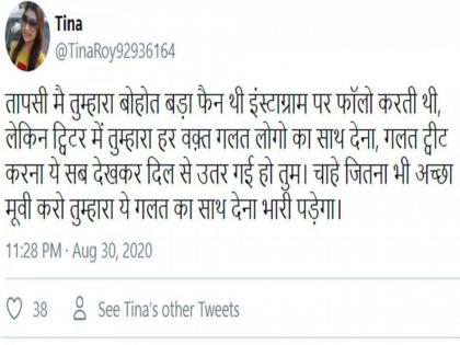 तापसीच्या या ट्विटवरून लोकांनी तिला फारच ट्रोल केलंय. एका यूजरने लिहिले की, 'तापसी मी तुझी फार मोठी फॅन होते. इन्स्टाग्रामवर फॉलो करत होते, पण ट्विटरवर तुझं प्रत्येक वेळी चुकीच्या लोकांना साथ देणं, चुकीच ट्विट करणं....हे सगळं बघून मनातून उतरली तू. कितीही चांगला मुव्ही केला तरी तुला चुकीची साथ देणं महागात पडेल'.