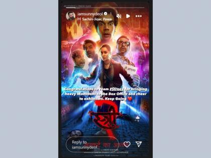 स्त्री २ च्या यशाने संपूर्ण सिनेइंडस्ट्री खूप आनंदी आहे. सनी देओलने सोशल मीडियावर चित्रपटाच्या यशाचे कौतुक केले आणि संपूर्ण टीमचे अभिनंदन केले. तारा सिंगची ही पोस्ट सोशल मीडियावर चांगलीच व्हायरल होत आहे. सनी देओलने त्याच्या इंस्टाग्राम स्टोरीवर स्त्री २चे पोस्टर शेअर केले आणि त्याचे खूप कौतुक केले. त्याने लिहिले की, बॉक्स ऑफिसवर जोरदार कलेक्शन केल्याबद्दल टीम स्त्री २चे खूप खूप अभिनंदन. असेच पुढे जात राहा. हार्ट इमोजीही पोस्ट केली.