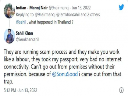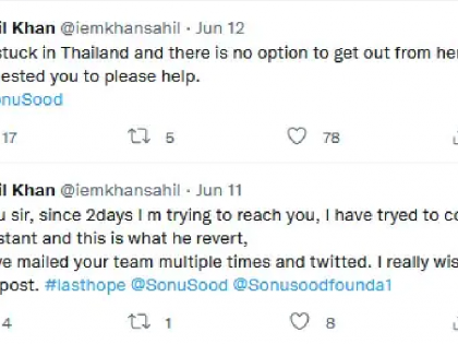 11 जून रोजी साहिल खान नावाच्या ट्विटर युझरने सोनू सूदला ट्विटमध्ये टॅग करुन परत येण्यासाठी मदत मागितली होती. साहिलने लिहिले, “मी थायलंडमध्ये अडकलोय आणि येथून बाहेर पडण्याचा कोणताही पर्याय उपलब्ध नाही. सोनू सर, मला मदत करा." सोनूने या ट्विटला फक्त एका दिवसात उत्तर दिले आणि सांगितले की, "आता कुटुंबाला भेटण्याची वेळ आलीय. मी तुला तिकीट पाठवत आहे."