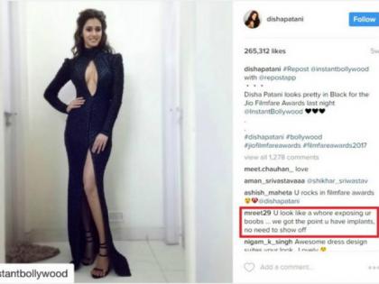 निकोलस जिब्रान यांनी डिझाइन केलेल्या या ड्रेसमध्ये दिशा जबरदस्त हॉट दिसत होती. तिने याच ड्रेसमधला एक फोटो इन्स्टाग्रामवर शेअर केला. मात्र नेटिझन्सने तिच्या या फोटोला खूपच गलिच्छ कमेण्ट दिले. त्यातील एका यूजर्सने तर तिला चक्क ‘वेश्या’ असे म्हटले. ‘तू या ड्रेसमध्ये वेश्यासारखी दिसत आहेस. आम्हाला माहीत आहे की तू ब्रेस्ट इंप्लांट्स केले आहे, मग लोकांना का बरं दाखवित फिरत आहेस’ यूजर्सची ही कमेण्ट वाचून मात्र दिशाचा चांगलाच पारा चढला तिनेही त्याला जशास् तसे उत्तर दिले.