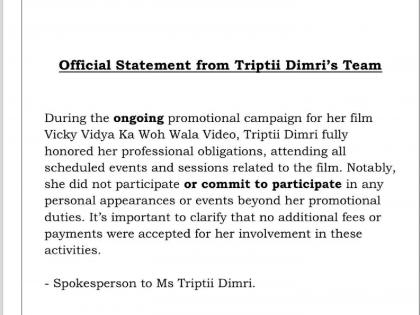 यावर तृप्तीच्या टीमकडून स्पष्टीकरण आले की, ""तृप्तीच्या 'विकी और विद्या का वो वाला व्हिडिओ' या सिनेमाचं सध्या प्रमोशन सुरु आहे. तिने तिच्या प्रोफेशनल कमिटमेंट्स पूर्ण केल्या आहेत. सिनेमासंबंधित शेड्युल केलेल्या सर्व इव्हेंट्सला ती जात आहे. महत्वाची गोष्ट म्हणजे तिने प्रमोशन सोडून वैयक्तिकरित्या एकटीने कोणत्याही इव्हेंटला होकार दिलेला नव्हता. हे स्पष्ट करणं गरजेचं आहे की यासाठी तिने कोणाकडूनही पैसे किंवा मानधन घेतलेलं नाही."