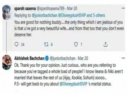 याच उत्तर देताना अभिषेक बच्चनने लिहिले, 'ठीक आहे. आपल्या मताबद्दल धन्यवाद. फक्त हे जाणून घेऊ इच्छित आहे .. आपण कोणाशी बोलत आहात कारण आपण बर्याच लोकांना टॅग केले आहे. मला माहित आहे की इलियाना आणि निक्कीचे लग्न झाले नाही, म्हणून आम्ही (अजय, कुकी, सोहम) वाचलो. PS- मी तुम्हाला डिस्ने स्टेट हॉटस्टार व्हीआयपीच्या मॅरिटलबाबत विचारुन सांगतो. '