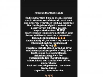 विकी कौशलने त्याच्या इन्स्टाग्रामवर स्टोरी शेअर केली आहे. त्याने 'धुरंधर २'च्या संपूर्ण टीमचं कौतुक केलं आहे. "मी खूपच थक्क झालो आहे, खूप अभिमान वाटतोय आणि तुम्ही हा चित्रपट ज्या कलेने, मेहनतीने आणि प्रामाणिकपणे बनवला आहे. त्याबद्दल पूर्णपणे भारावून गेलो आहे. हे खरंच सुवर्णमापदंडापेक्षा कमी नाही. या यशाच्या प्रत्येक क्षणासाठी तुम्ही पात्र आहात. अभिनंदन भाऊ", असं विकीने म्हटलं आहे.