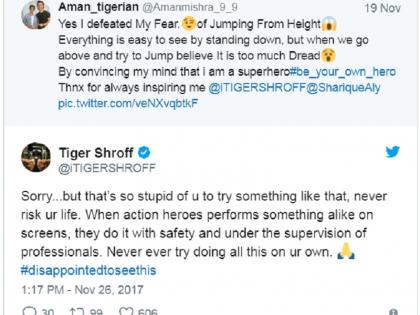 खरे तर आपला व्हिडिओ पाहून टायगर आपल्याला शाब्बासकी देईल, प्रशंसा करेल, असे या चाहत्याला वाटले होते. पण झाले भलतेच. हा व्हिडिओ पाहून या चाहत्याला शाब्बासकी देण्याऐवजी टायगर नाराज झाला. ‘माफ कर, पण असा स्टंट करणे मूर्खपणा आहे. कधीही स्वत:चे आयुष्य धोक्यात घालू नकोस. पडद्यावरचे अॅक्शन सीन्स तज्ज्ञांच्या मार्गदर्शनाखाली होतात. चित्रपट पाहून स्वत: असे स्टंट करण्याचा प्रयत्न करू नकोस,’ असे टायगरने या चाहत्याला सुनावले. रिअल लाईफ आणि रिल लाईफमध्ये खूप फरक असतो. मित्रांच्या व कुणाच्याही म्हणण्यावर पडद्यावरच्या अॅक्शन हिरोचे स्टंट करू नका, असे टायगरने याआधीही सांगितले आहे.