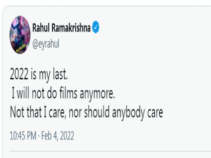 अभिनेता राहुल रामकृष्णने शुक्रवारी संध्याकाळी आपल्या ट्विटर हॅन्डलवरून चित्रपटसृष्टी सोडत असल्याचा निर्णय जाहीर केला. ट्विटरवर एक छोटी नोट लिहित त्याने या निर्णयाची माहिती दिली.